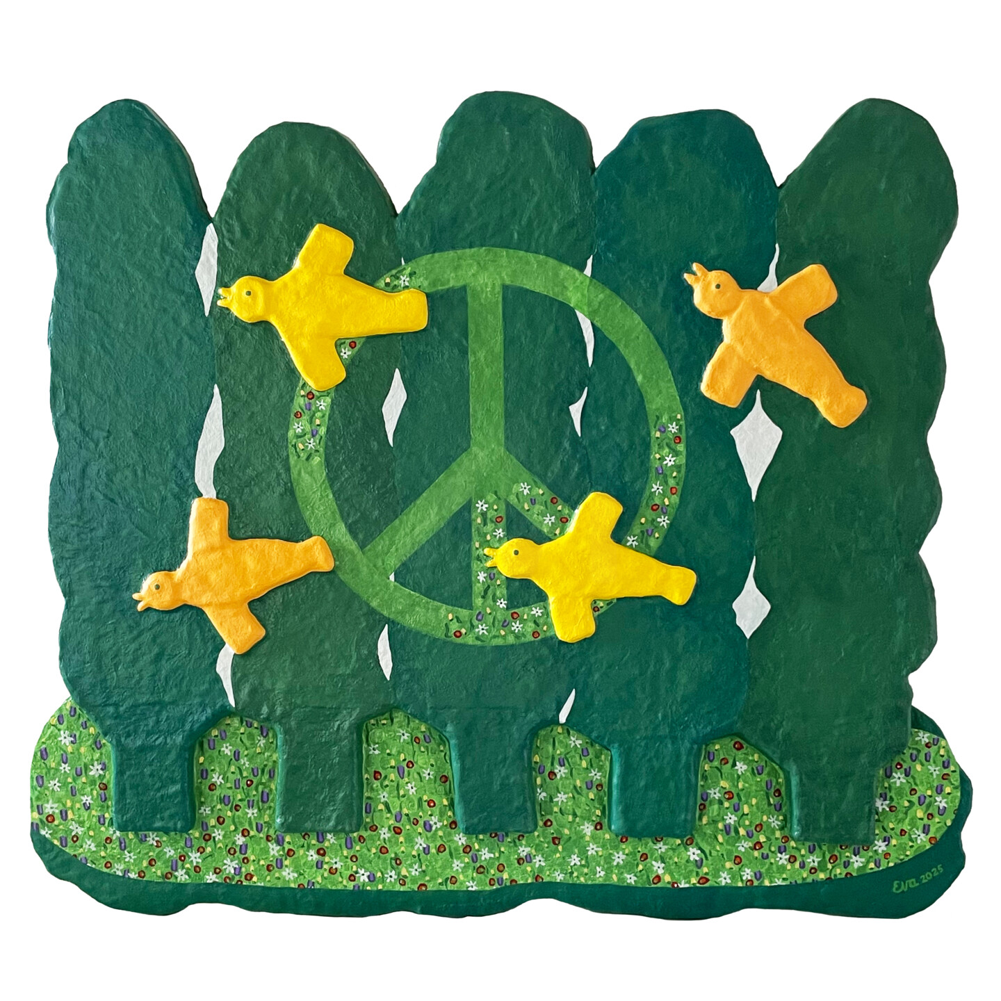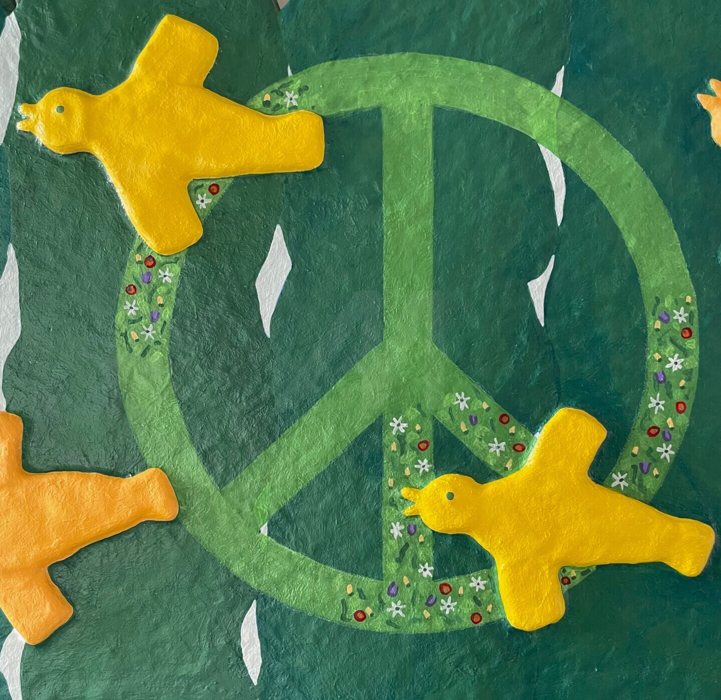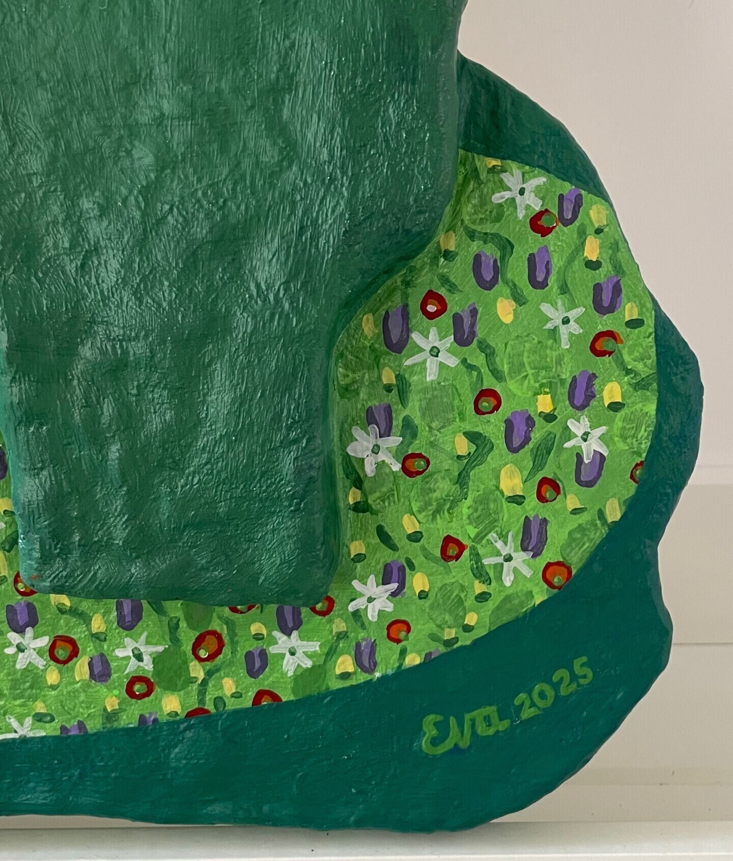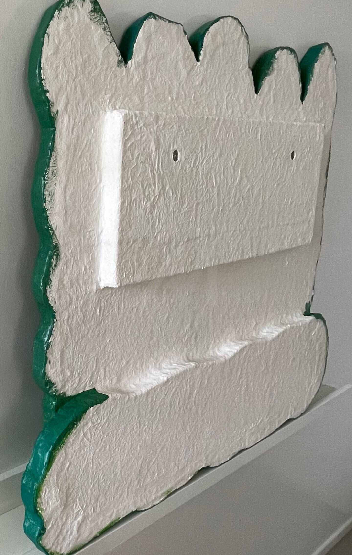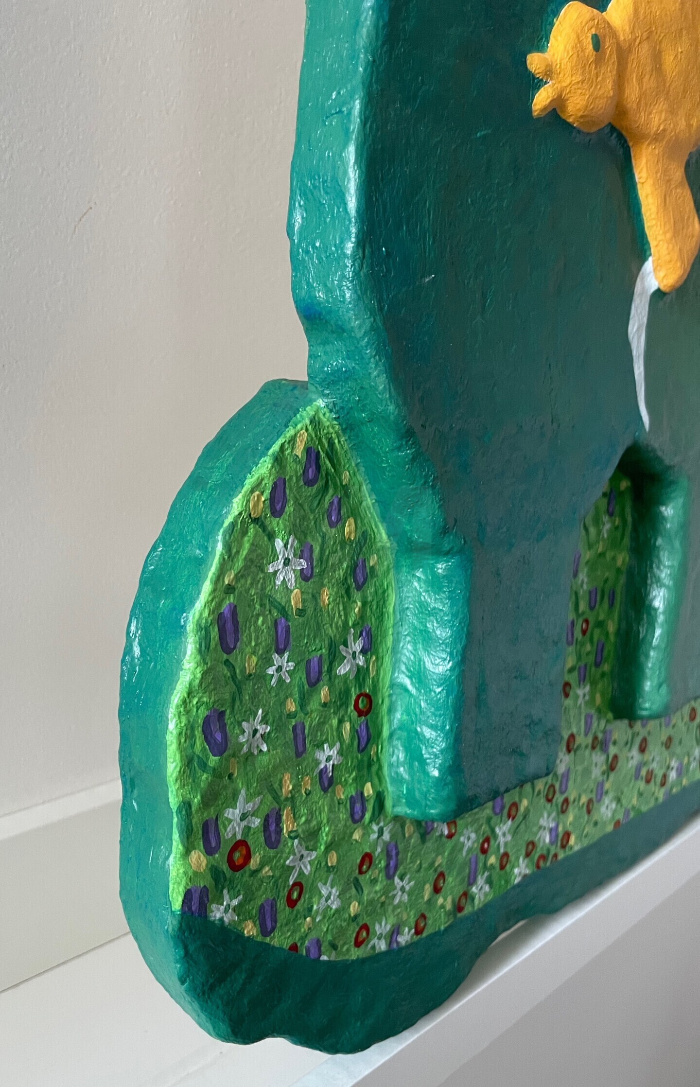 Grand bas-relief, prêt à accrocher, fait en fibre de verre stratifiée peinte acrylique puis vernis.